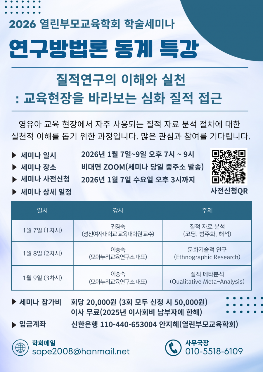 2026년 열린부모교육학회 학술세미나 연구방법론 동계 특강 안내 페이지 정보 작성자 열린부모 작성일25-12-08 09:41 조회11회 댓글0건 다음글 목록 본문 안녕하세요, 회원님2026년 열린부모교육학회 학술세미나 연구방법론 동계 특강이 2026년 1월 7일부터 9일까지 3일간 진행될 예정입니다.많은 관심과 참여 부탁드립니다. 댓글목록 등록된 댓글이 없습니다. 다음글 목록